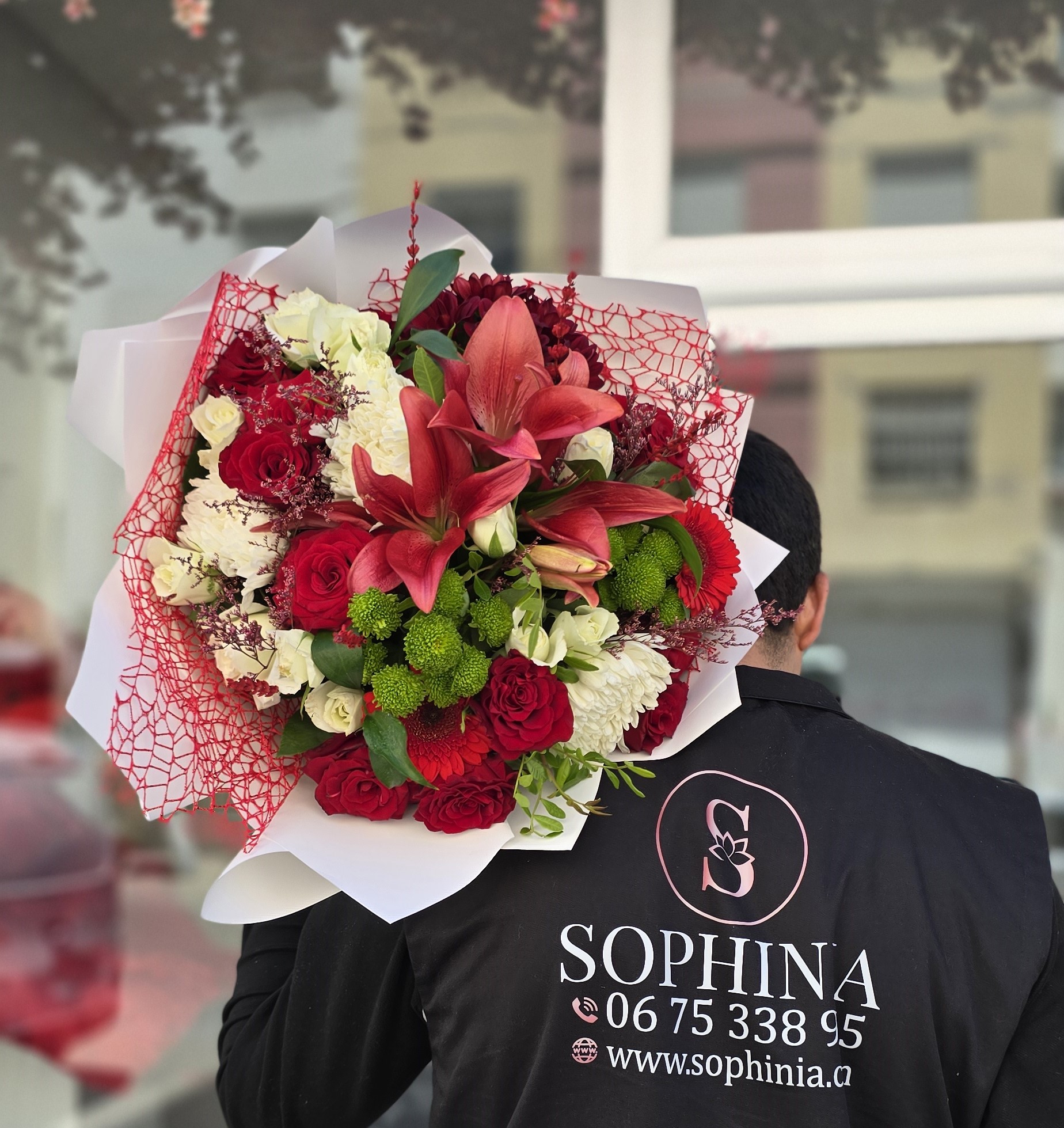 A luxurious red and white floral bouquet with lilies, roses, and carnations. Elegant, romantic, and perfect for special occasions. Substitutions may apply with premium flowers.