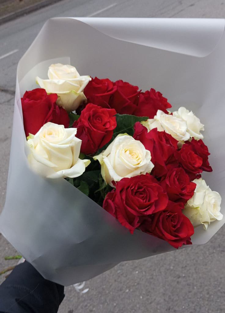 This stunning bouquet of 18 red and white roses is a refined expression of elegance and emotion. The bold intensity of red roses beautifully contrasts with the soft purity of white blooms, creating a visually captivating arrangement that is both timeless and sophisticated.